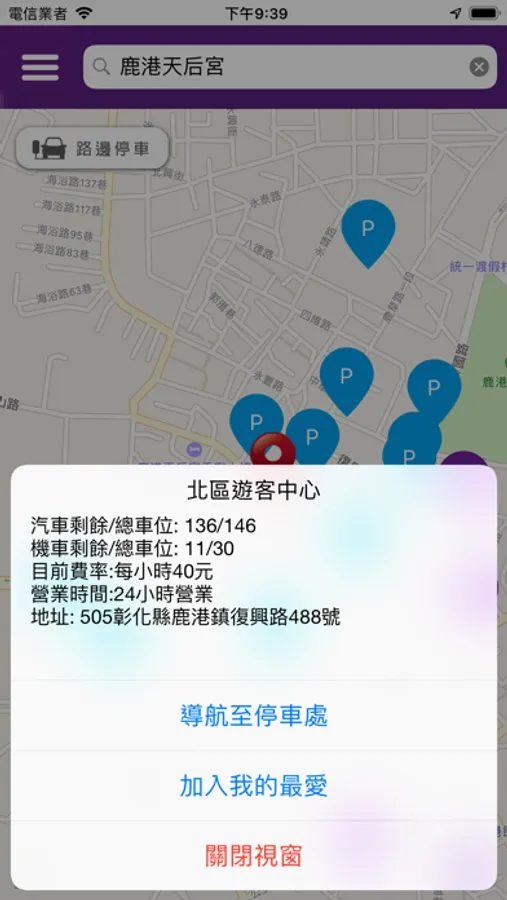 提供民眾快速搜尋彰化縣的路外與路邊停車資訊,提供營業時間、費率與剩餘車位等訊息,幫助您快速鎖定停車目標。