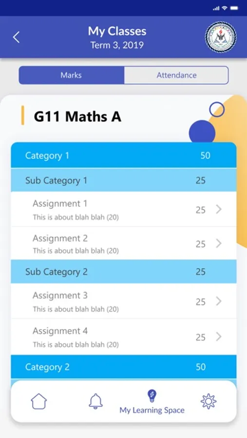 • Classes: list of subjects being taught in the current term or cycle, past and upcoming.