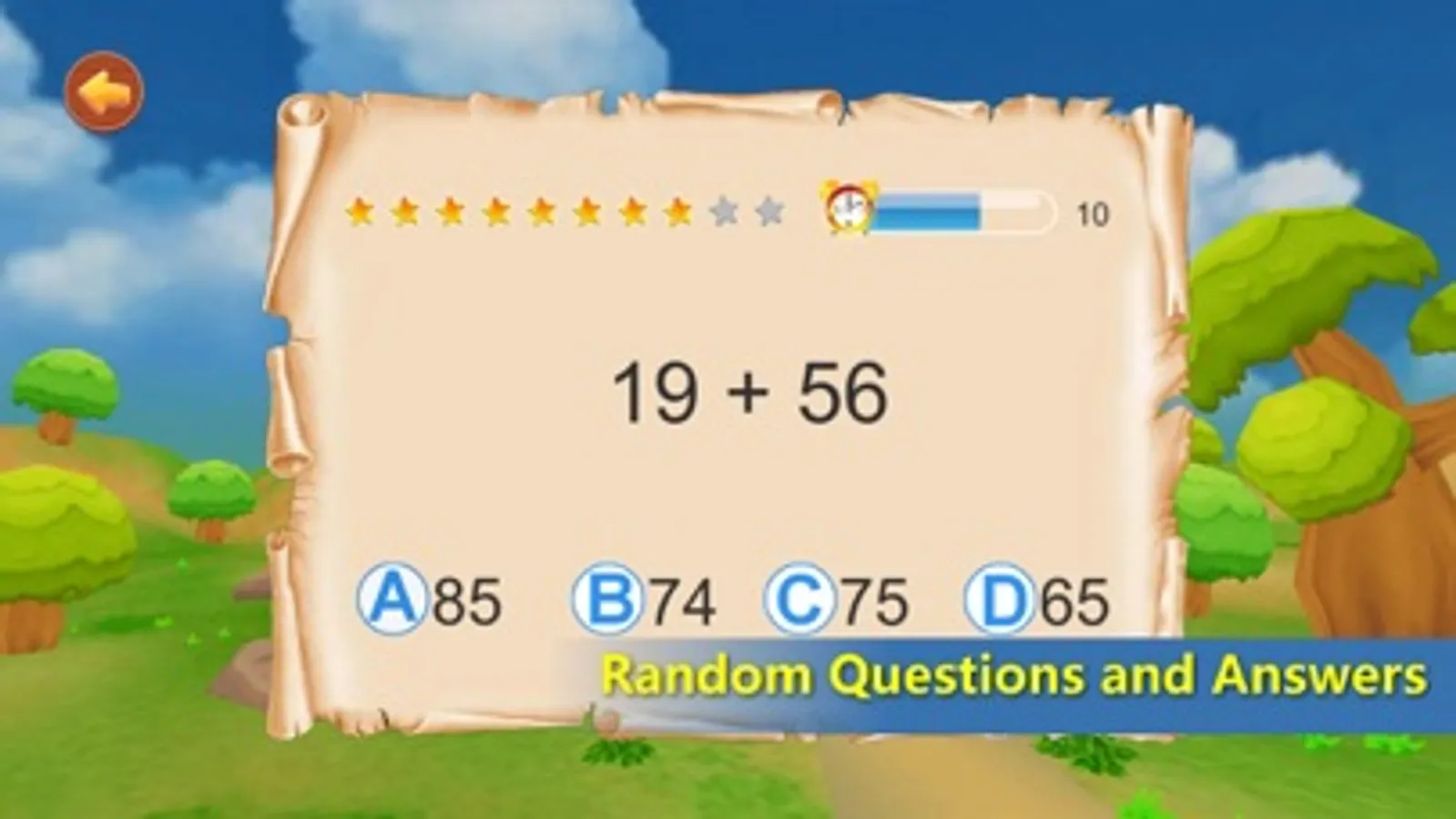 每次进入关卡,相应的题目和答案都重新随机生成,做每道题目均有时间限制,并且做对的题目越多,获得的金币也越多,从而提升做题的速度和准确率,以此保证练习的效果。