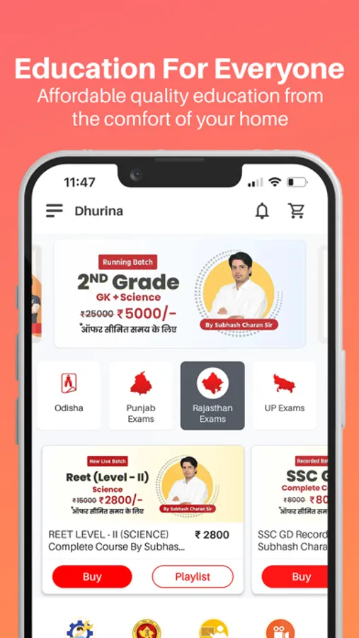 Dhurina is very easy to use, when you open this online exam preparation app you have friendly home screen where you have 4 options 1st is Video Lecture, 2nd is live streaming lecture, 3rd is Pdf lecture. So if you want to want learn full course then select the first option and if you want to join live streaming lecture then click on 2nd option or if you want lectures in Pdf format then click on 3rd option. With this Ibps Exam preparation 2020 app you can easily prepare your self for online mock test SBI PO, SSC CGL, Railway RRB & IBPS and SBI Clerk and more, so what are you wait for download this Online learning app.