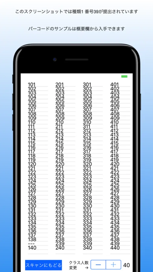 JAN短縮8桁バーコードを読み込みます。本アプリは4種類の提出物、クラスの人数max40人を想定して、4X40=160枚のバーコード とセットに使うことを想定しています。