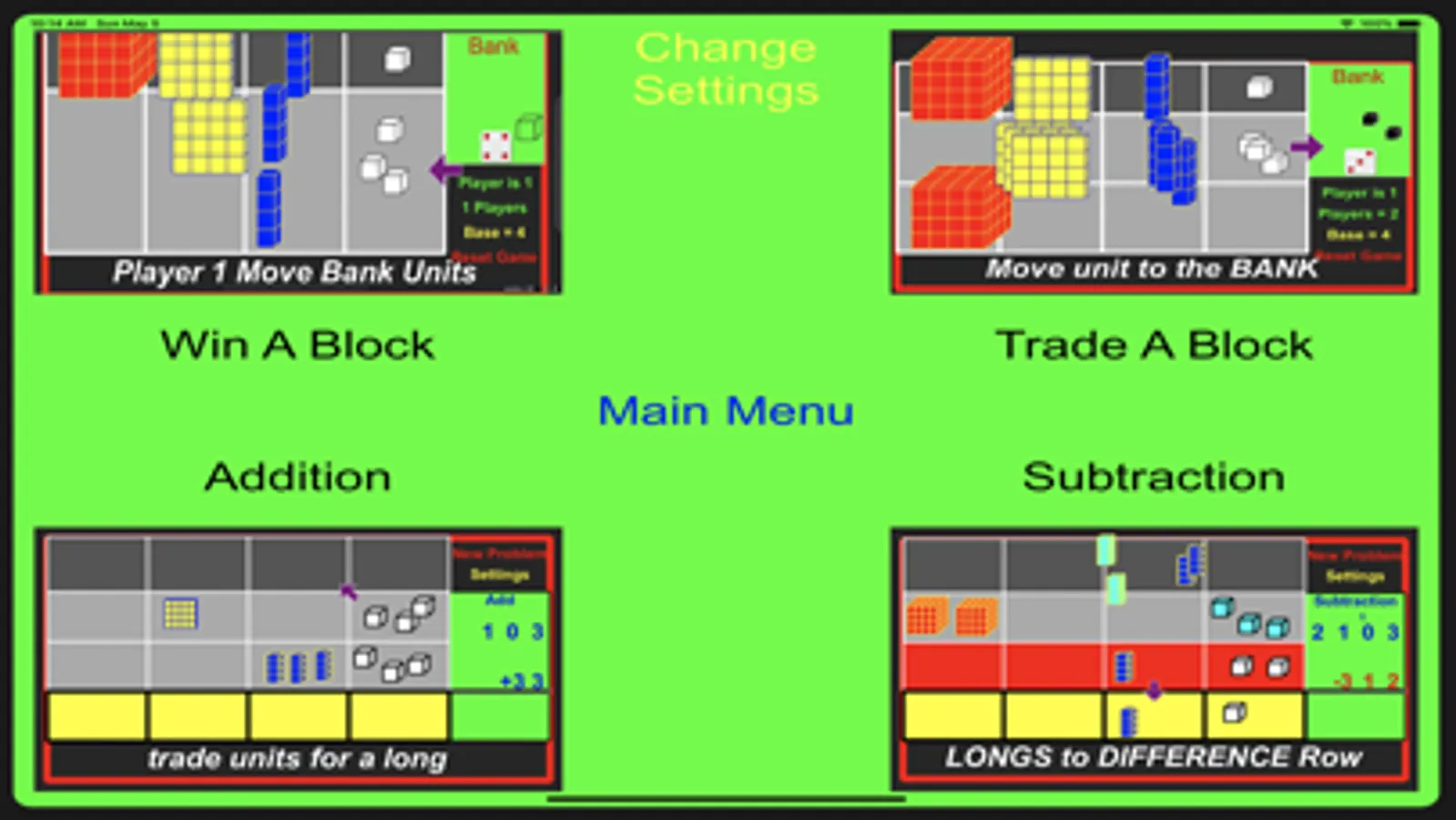 Multi Base Blocks Applications contains four apps to help young children proceed from the concepts of trading and place value through to the written algorithms for addition and subtraction. Preschool children can practice trades and learn about place value and grouping using the applications Win A Block and Trade A Block.