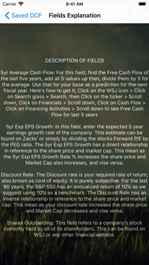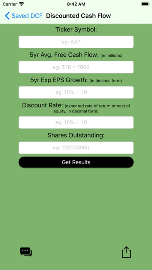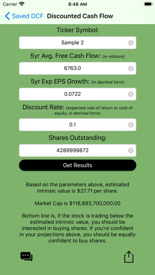 Equitapp finds the estimated intrinsic value of any given stock using the DCF (discounted cash flow) valuation method. To do so, it derives the intrinsic value from data of four (4) required parameters. The parameters are the 5 year average Free Cash Flow, 5 year Exp EPS Growth, Discount Rate (expected return or cost of equity, purely subjective) and Shares Outstanding. Based on the parameters you enter, it generates an estimated intrinsic value for the stock and market cap. Description of the parameters are provided and how/where to get them, along with steps on how the calculations are done. All of your valuations are saved and editable for you to reference back to, so you can now toss your big Excel spreadsheets.