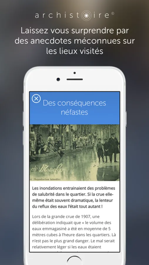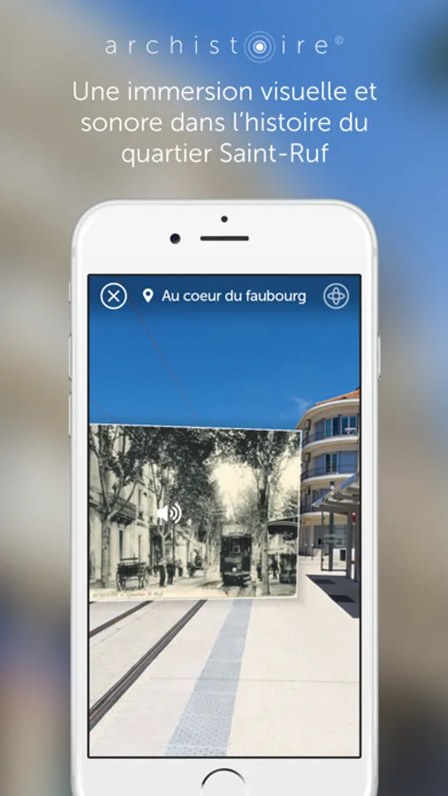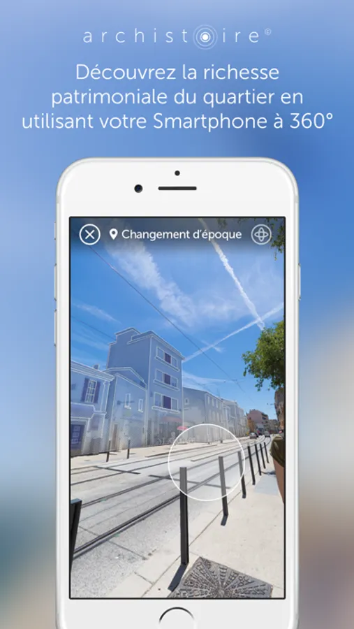 L’application vous géolocalise et vous notifie de la présence de sites remarquables à proximité. Levez votre Smartphone et explorez les lieux à 360°. Empruntant à la fois aux codes de la réalité augmentée et à ceux de la réalité virtuelle, Archistoire fonctionne sur un principe de panoramas interactifs photosphériques.