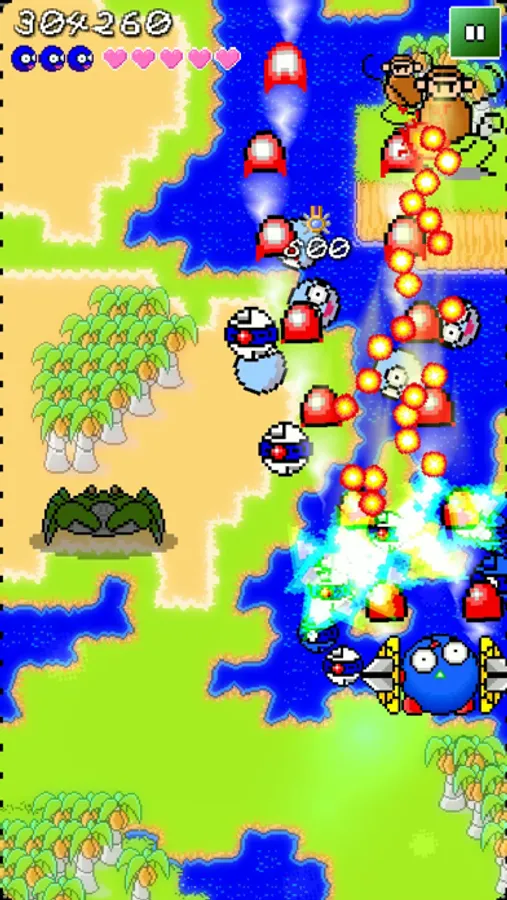 Select a stage and difficulty. Use the directional controls to avoid enemy bullets, and shoot down enemies using the attack button. Collect your friends to boost your score, and shoot at present boxes to switch to better weapons every now and then. When you see a flash on the ground, dig up the treasure, and if you get bombarded with enemy shots then use your precisions controls to slowly dodge them. Don't forget to 'pause' if you get tired.
