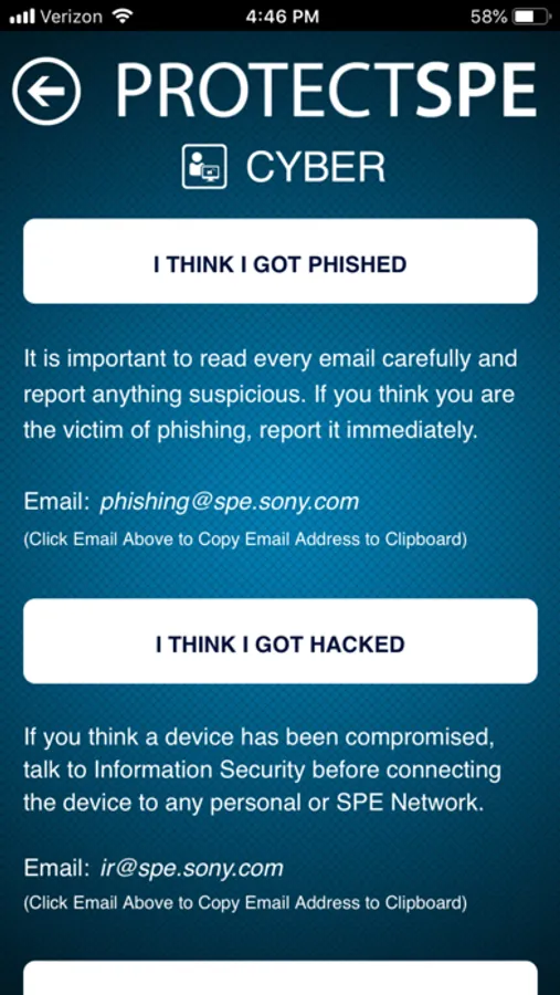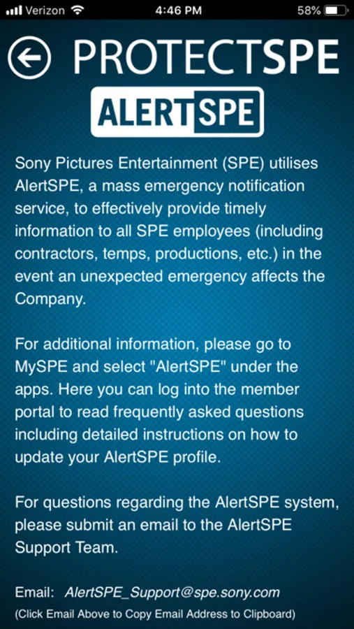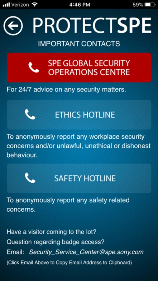 The ProtectSPE application empowers Sony Pictures Entertainment employees, partners and visitors to quickly access information about emergency procedures, contacts and other useful safety related details.
