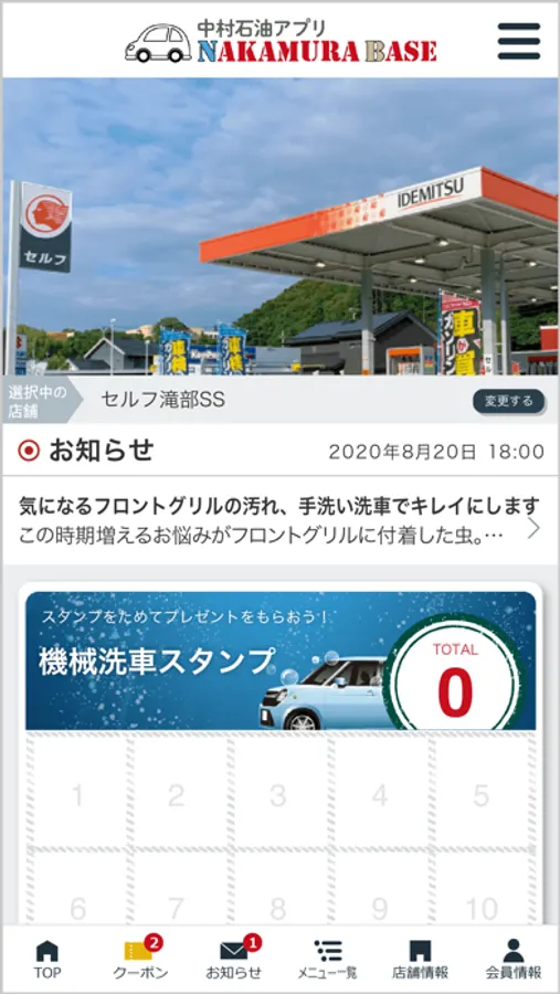 当社の公式アプリ「中村石油アプリ」は機械洗車やカーメンテナンスを行うたびにスタンプが貯まり、決められたスタンプ数を貯めるとお得なプレゼントクーポンと引き換えができる、貯めて楽しいもらえて嬉しいお得なアプリです。また、アプリで簡単に洗車・コーティングなどのご予約や愛車のメンテナンス管理が可能の他、当店で利用いただけるお得なクーポンや各種メニューの割引情報を配信しております。