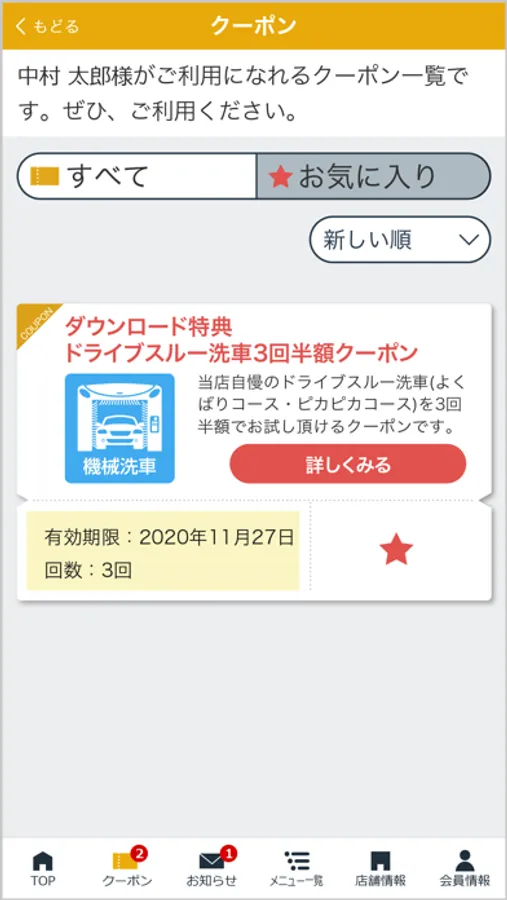 機械洗車やカーメンテナンスを行うたびにスタンプが貯めることができます。