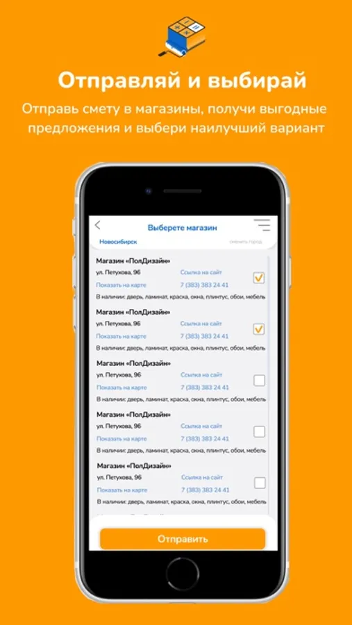- Просмотр доступных магазинов вашего города с геолокацией и наличием материалов из сметы;