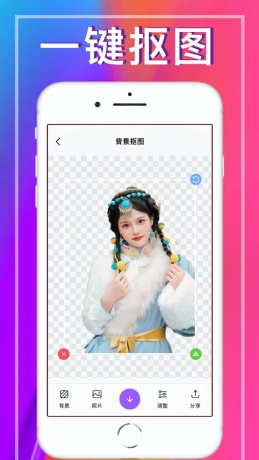 【一键抠图】采用当今先进的人脸融合智能技术实现一键抠图换背景功能,可以任意更换照片背景, 轻松发现让自己变美丽、变帅气的模样;