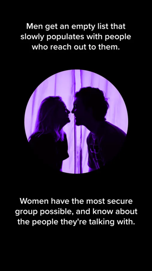 Women get a list of heavily vetted, background verified men that they can reach out to. They can't see her profile until she reaches out.