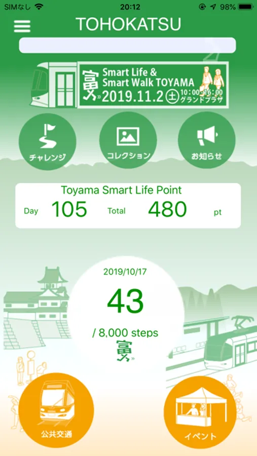 とほ活アプリは、歩くことや公共交通の利用、イベントへの参加等に応じてポイントが付与されるとほ活を推進する富山市公式のアプリです。