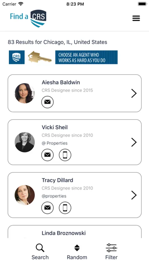 Find A CRS Mobile App is the fast and easy way to search for a Certified Residential Specialist referral. Whether you’re a current CRS, a Realtor®, or consumer in the market to buy or sell a home, you now have the top 3% of all Realtors® at your fingertips. Search by city, neighborhood, or agent last name to find all CRS agents specializing in that area to help complete your transaction. Once you find an agent you’d like to work with, simply tap on their contact information to call, text or email.
