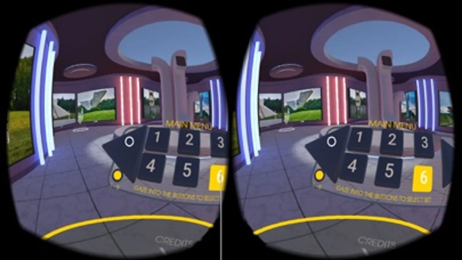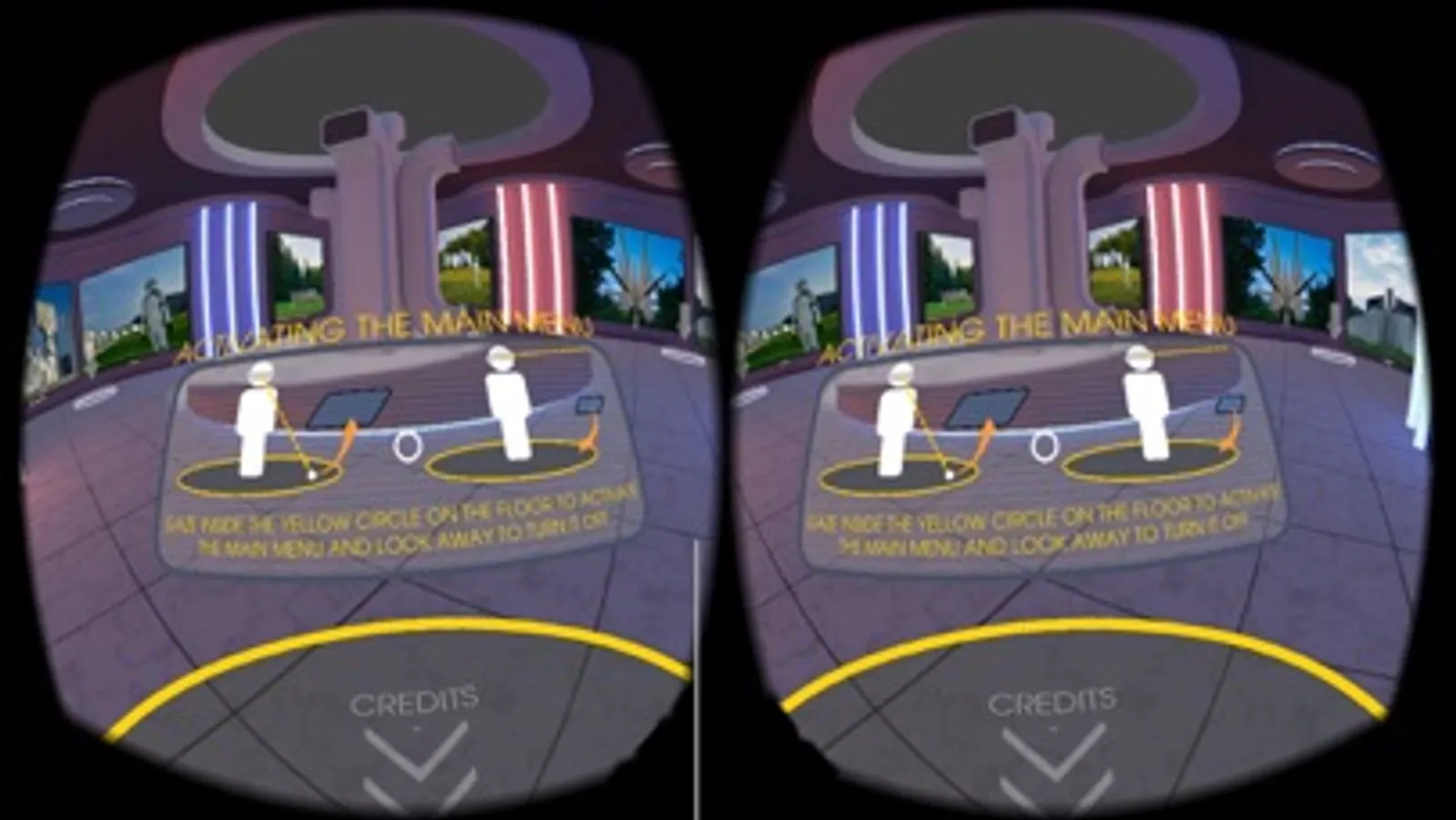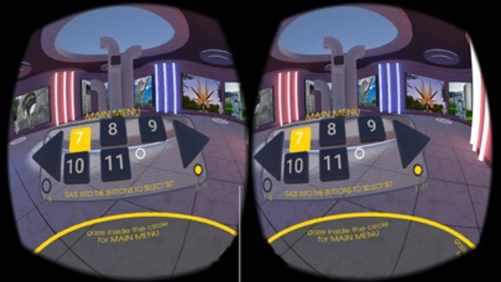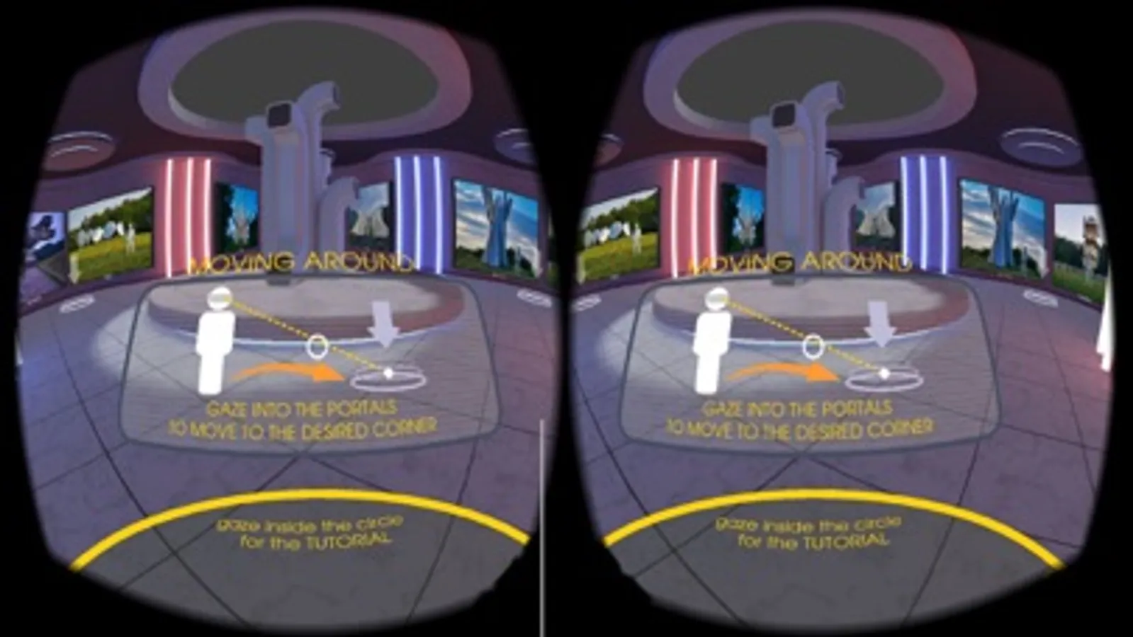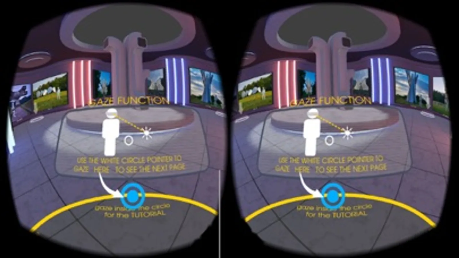 Gaze down to access the menu with options to change exhibition set. No need to use any kind of controllers. Everything is handled by "where your gaze" commands.