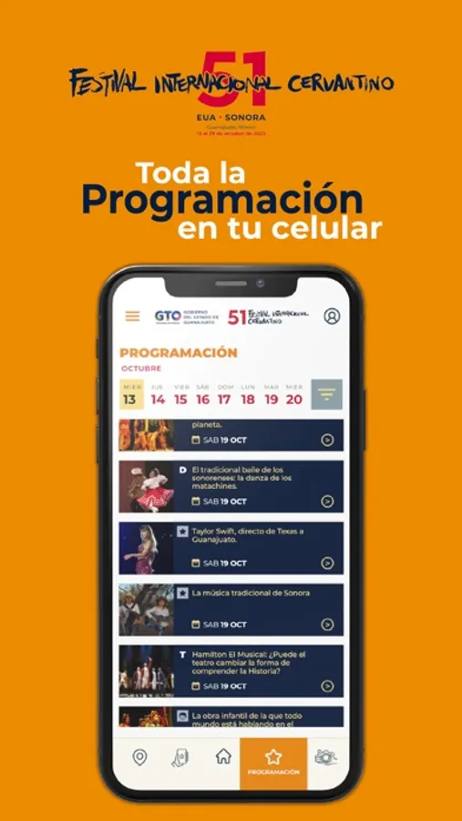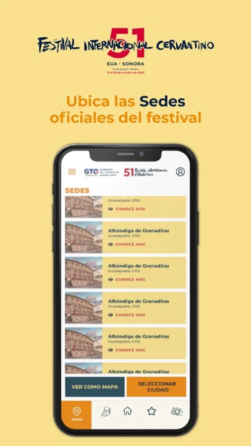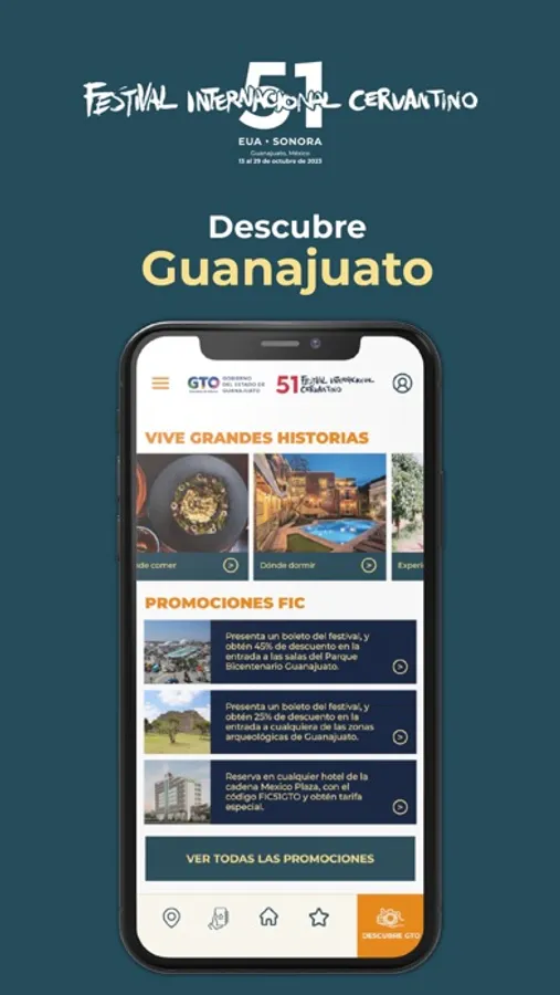 Te invitamos a usar esta aplicación para ser parte de esta edición al seleccionar la actividad de tu interés, ubicar las sedes oficiales, conocer la oferta turística de Guanajuato, conocer los museos del estado y más