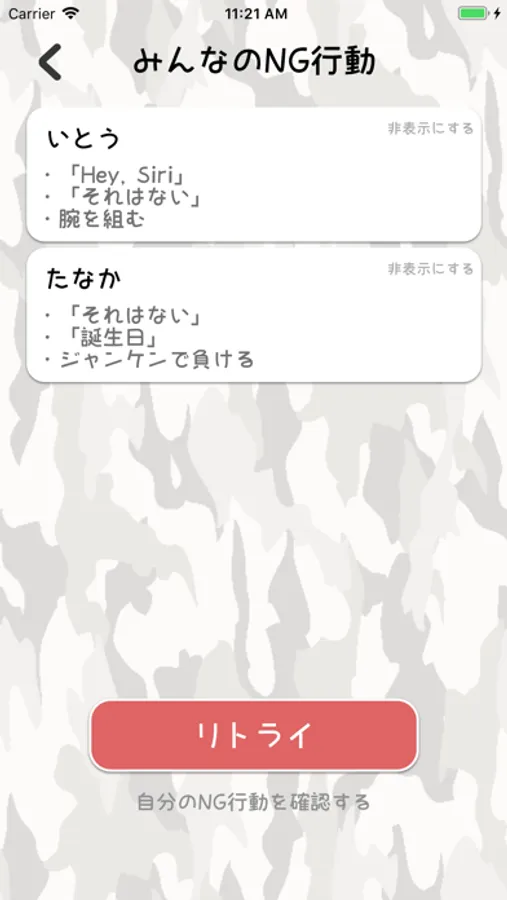 参加者それぞれにNG行動が割り当てられ、その行動をしてしまったらその人はその時点で失格!
