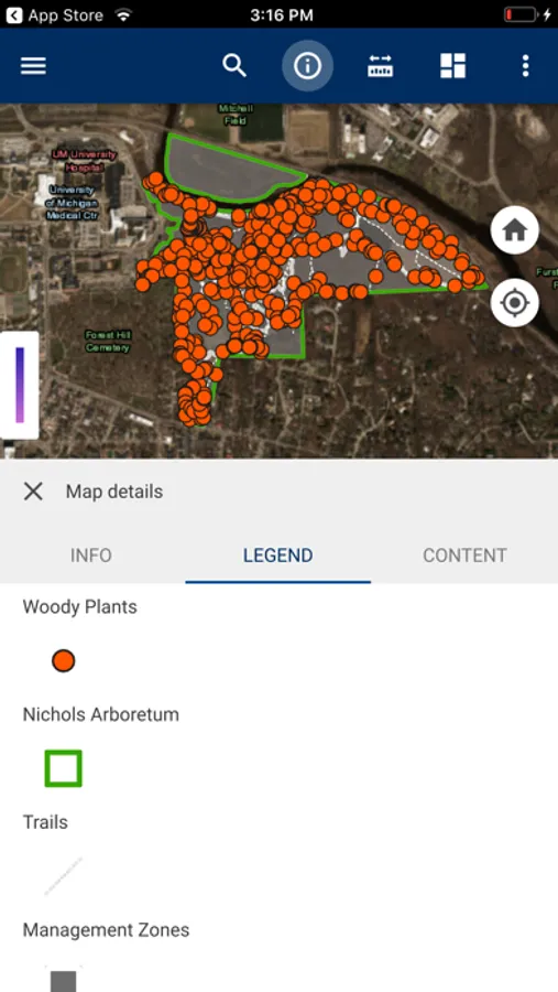 Discover 117 species of trees, shrubs, and vines in the Nichols Arboretum at the University of Michigan in Ann Arbor. These data were originally collected for use by the Woody Plants course at University of Michigan, and now it is available to the public! We have found over 500 examples of woody plants in Nichols Arboretum that are on the Woody Plants study list. Use your location to move around the Nichols Arboretum and tap on the points on the map to learn the different species of trees around you, including information like: DBH, condition, common name, estimated height, images, and more. Using this app, users can also measure distances and areas, change to various basemaps, and link to the Michigan Flora website. Michigan Flora contains detailed scientific information about woody plants (created by the U-M Herbarium).
