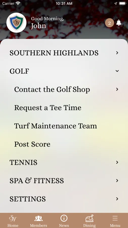 Welcome to Southern Highlands, where the experience of our members is our primary focus. We have developed a custom app to enhance your experience on and off property. With a touch of a button, you can send a direct message to the concierge or golf shop, get your car from valet, view your monthly statement and even order food and beverage with delivery. We hope you enjoy the new, digital experience at Southern Highlands.