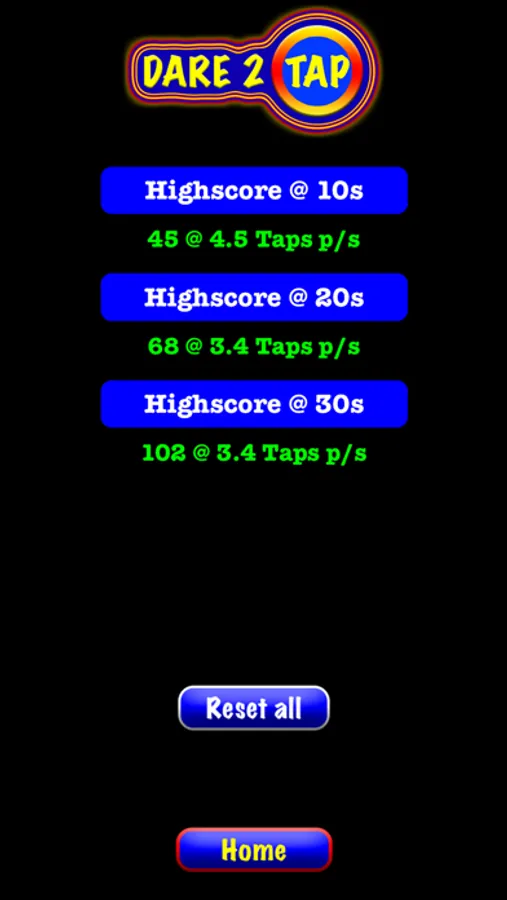 Dare2Tap is a simple tapping game, which involves a player to challenge him/herself in tapping the button within a selected time frame. There are three time slots to choose from. However, there is a small twist to the game, which is that the button keeps moving around within the tapping area at certain intervals. This app is intended for all ages. It can be used for improving motor skills for children and adults. It maintains a record of high scores attained by the player at each time slot and also, displays the average taps per second at the end of a session. Overall, it's a very simple yet, fun and addictive tapping game.