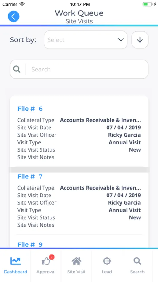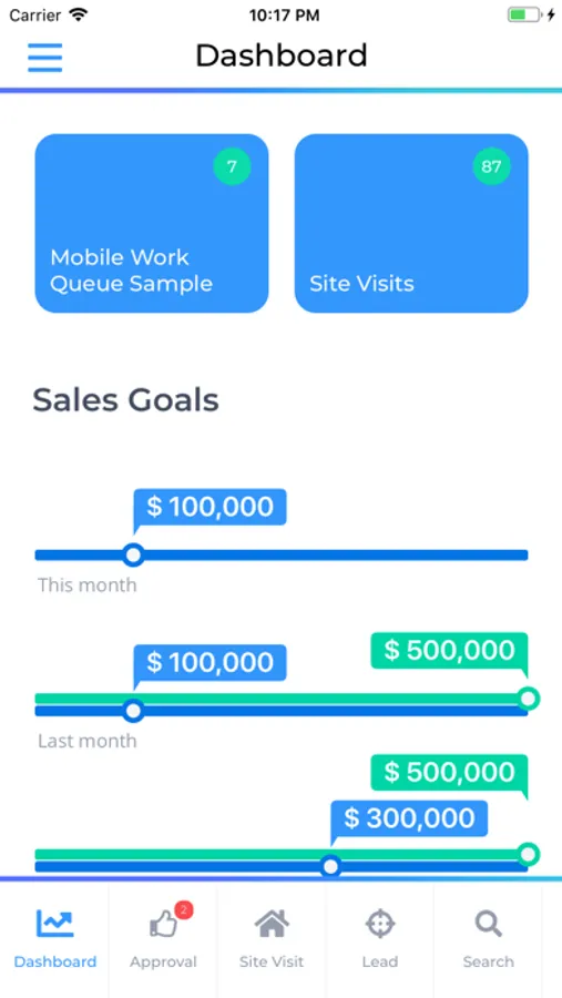 The app provides access to Sales Goals, Approvals, Site Visits, Leads, Work Queues, Chat and more.