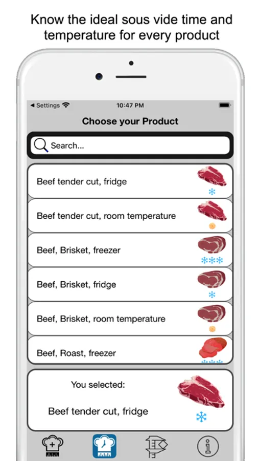Always get the perfect Sous Vide time and temperature based on your ingredient and its size.