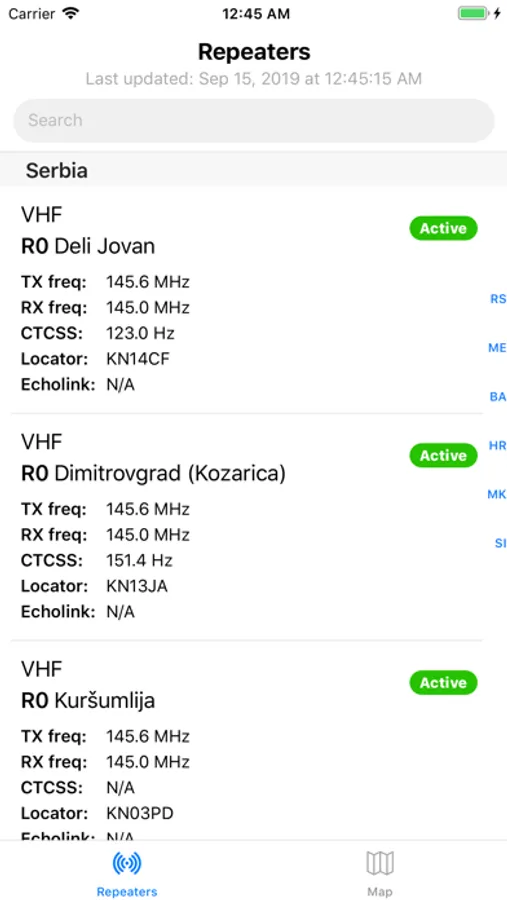 Browse amateur radio (HAM) repeaters, test radio nodes, echolink nodes and APRS digipeaters. The app covers the following countries: Serbia, Bosnia and Herzegovina, Slovenia, North Macedonia, Croatia and Montenegro.
