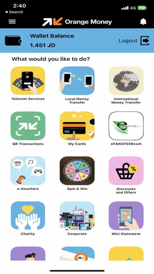 Orange Money is an electronic wallet which is a simple and digital alternative to conduct and manage all your financial services and transactions in your life. Make more time for yourself and your loved ones by using Orange Money services, and pay Post Paid bills, refill prepaid accounts, access eFAWATEERcom services, send domestic transfers, cash in and out through Orange shops, authorized Points of Sale, Partners and ATM’s, with the ability to shop online and use your Visa companion card while traveling around the world, and many other services.