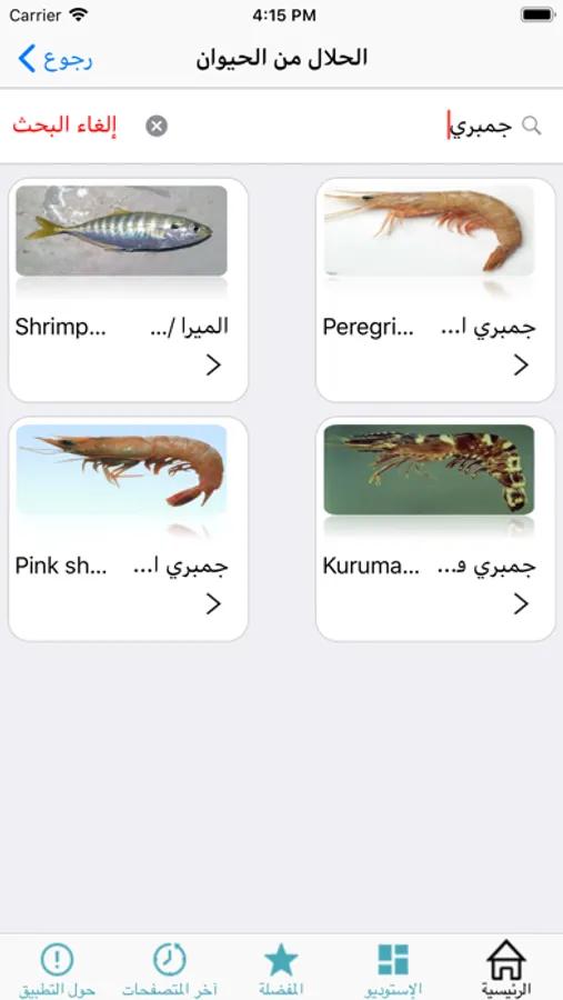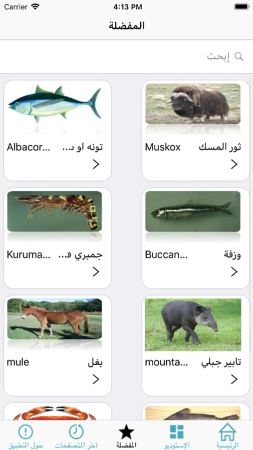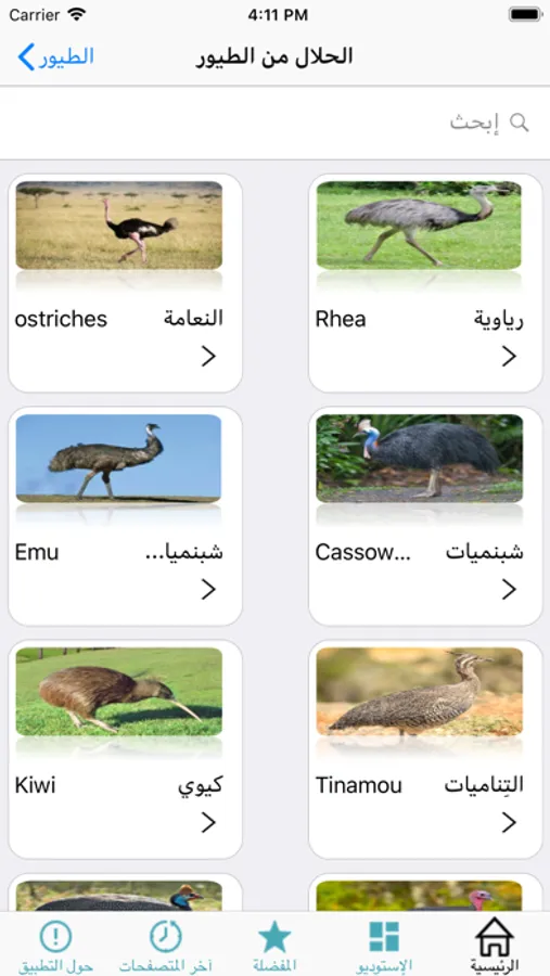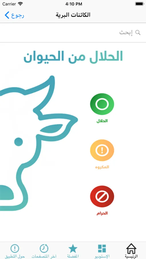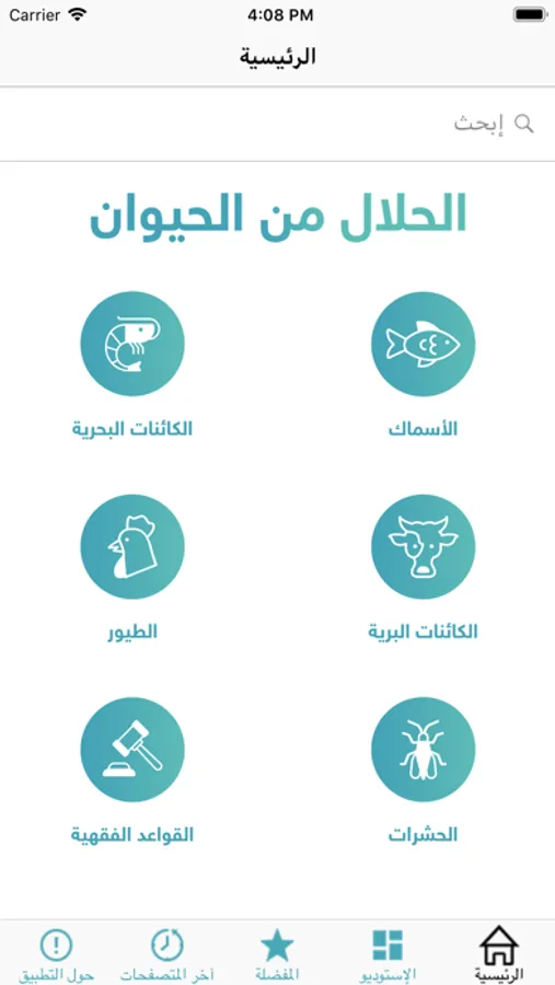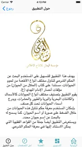 بإمكان المستخدم معرفة حكم تناول هذه الحيوانات من خلال الضغط على صورة أو اسم الحيوان، كما يسمح له بالبحث عن اسم حيوان محدد.