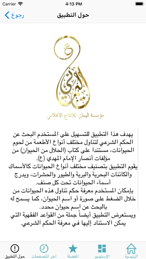 يهدف هذا التطبيق للتسهيل على المستخدم البحث عن الحكم الشرعي لتناول مختلف أنواع الأطعمة من لحوم الحيوانات، مستندا على أحد إصدارات أنصار الإمام المهدي (ع) (الحلال من الحيوان) من تأليف الأستاذ. علي أبوأقلام