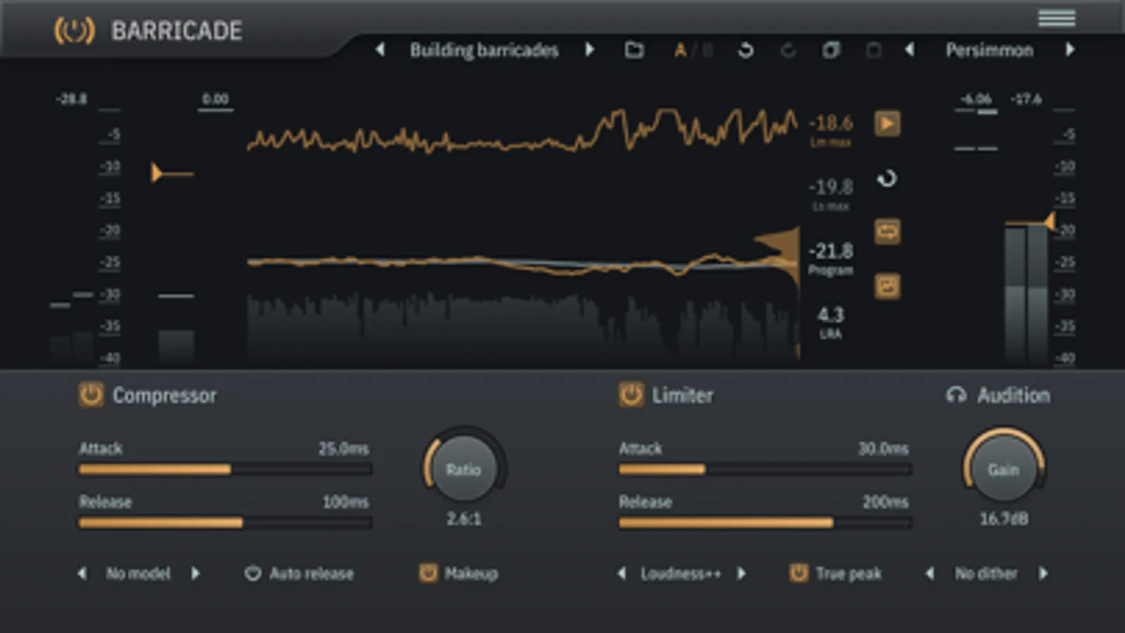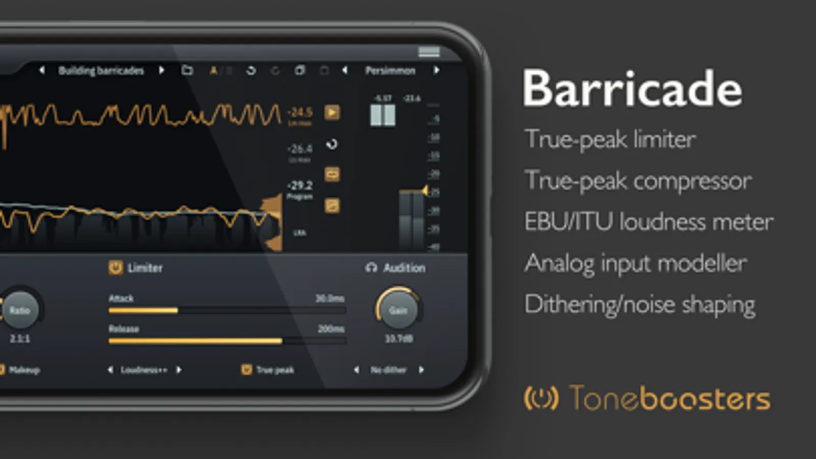ToneBoosters Barricade is a studio-quality, professional, true-peak limiter and peak compressor AUv3 / IAA plug-in with a gorgeous interface and integrated ITU / EBU compliant loudness measurement.