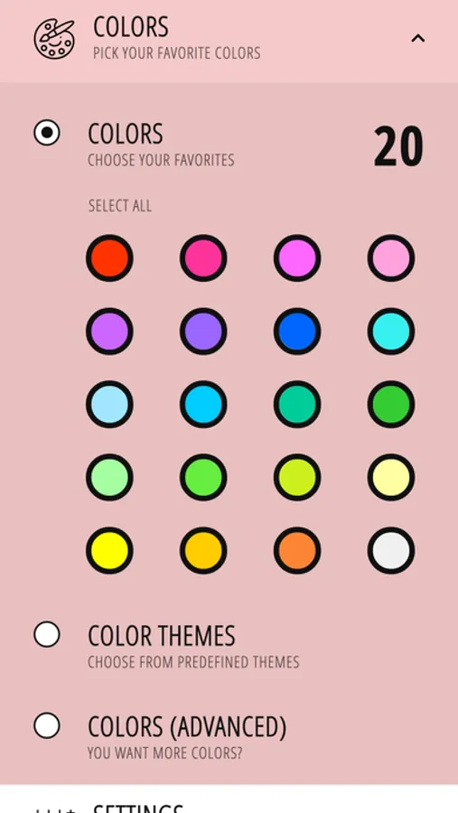 - COLORS: Choose one of the predefined color themes or select the colors to be included in the light show yourself
