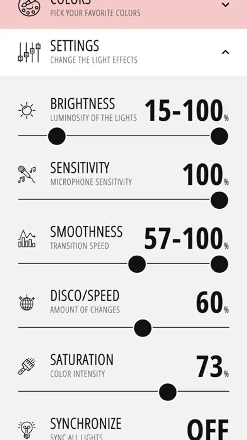 - SMOOTHNESS: Smoothness refers to the transition time between the states of your lights. A high value results in smooth transitions.