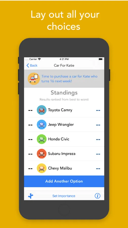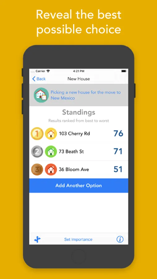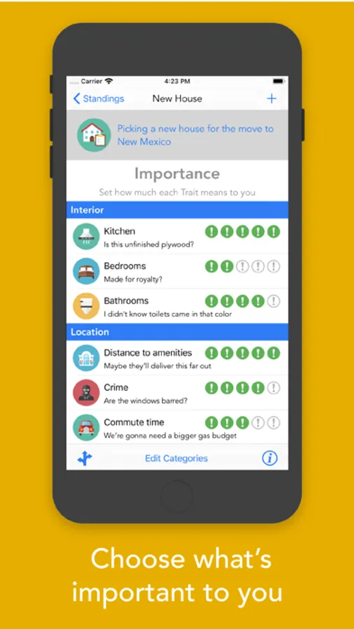• 3 built in Tradeoff templates: Cars, Houses, Schools