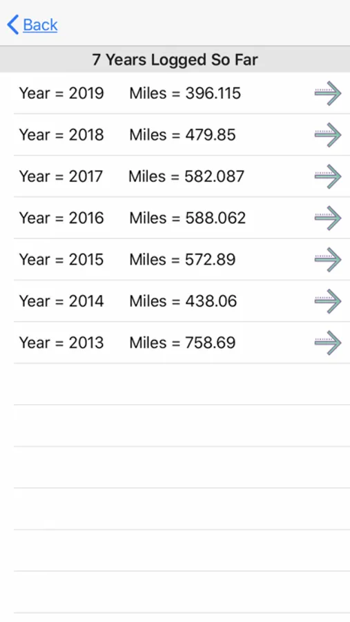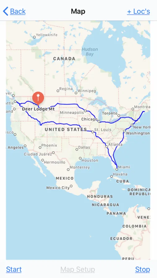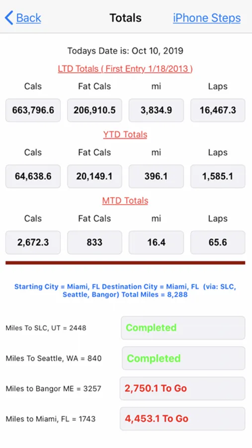 The app's summary feature allows you to drill down your data by years, months, and days. Additionally, you can use the map course that has been set up to track your distance progress. The course starts in Miami, FL, takes you through Salt Lake City, UT, Seattle, WA, Bangor, ME, and back to Miami, FL, covering a total of 8288 miles or 13,338 kilometers. You can view where you are on the map as you go and zoom in and out of your current location.
