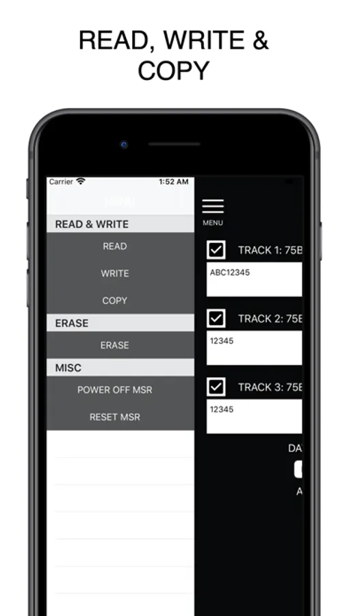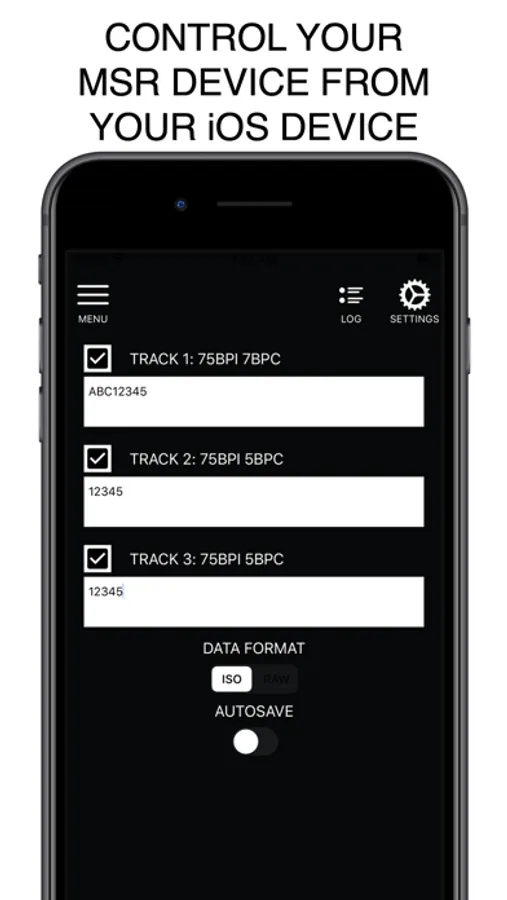 Simply open the app, select your MSR from the list of devices, and tap to connect. Once connected, you can read, write, and erase using your MSR device. You can edit the track data directly in the app, and enable and disable each track. You can also save your data to the Files app or to your iCloud account.