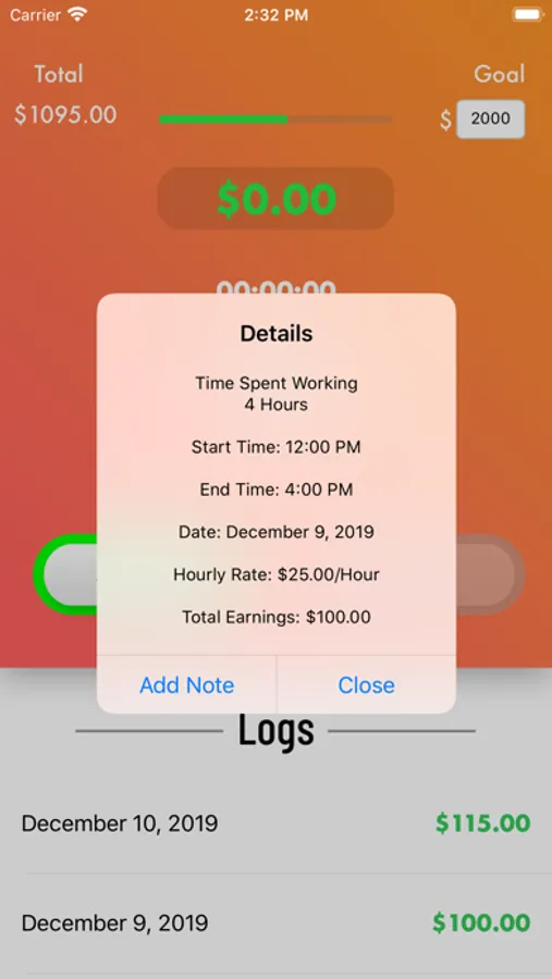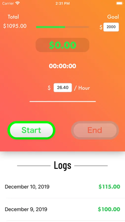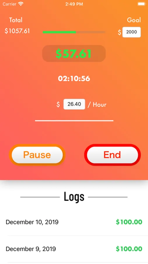 Have you ever wanted to see how much money you have made on a job at any given time after the job has started? Well now you can with the "Time to Money" App! Simply open the App, enter your hourly rate, and tap the Start button when you begin a job and watch your earnings grow per second! You can enter your device into sleep mode, exit the App, or even completely power off your device and whenever you open "Time to Money" again, it will update your earnings from the time you tapped the Start button to the current time and continue to calculate each second! On a break? No worries. Just tap the Pause button, and when you are ready to continue the job, tap the Resume button. Finished with a job? Nice work! Tap the End button to end the job and save a log! These logs can be viewed at any moment and contain information about that job. In addition, you can also set a goal that you wish to reach. Your goal can be changed at any time. There is also a "Time to Money" App for Apple Watch, where you can watch your earnings grow right on your wrist! And better yet, the Apple Watch version of the App can easily be accessed via a Watch face complication (there are multiple complication styles to choose from). Tap the complication, and see your earnings at a glance from within the App! The Apple Watch version of the App is also linked with the iPhone version of the App, ensuring that if you tap Start on one device, it will begin on the other device as well! When you tap the End button on the Apple Watch version of the App, a log is sent to your Phone. Oh yeah, and one more thing! After tapping the Start or Resume button, you will receive hourly notifications that let you know how much money you have made so far to help motivate you while you work!
