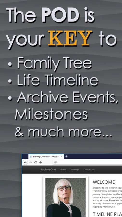 The POD is your key to creating and accessing an ArchiveOne timeline of your life. The POD stores your personally identifiable information on your device allowing secure access. With a single POD you can manage multiple ArchiveOne archives for yourself and your loved ones.