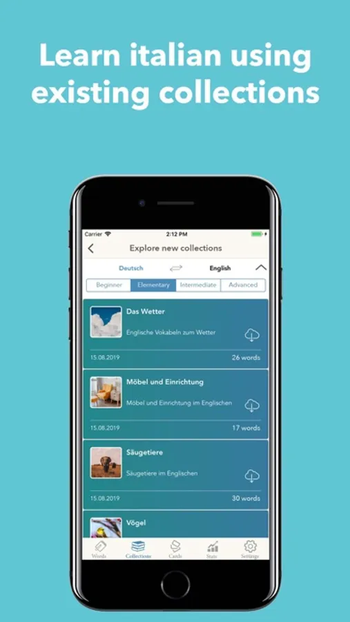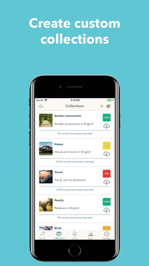 You can combine words into thematic collections and monitor the progress of studying collections. In the mode of working with flash cards you can study your collections. Create your own collections on topics that interest you!