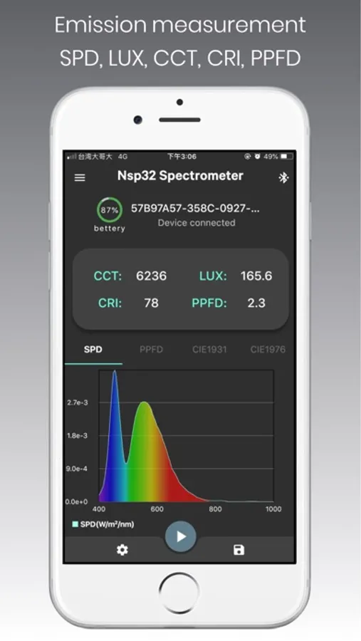 1) Emission measurement (SPD, PPFD, LUX, CRI, CCT, CIEXYZ, CIExy, CIEuv )