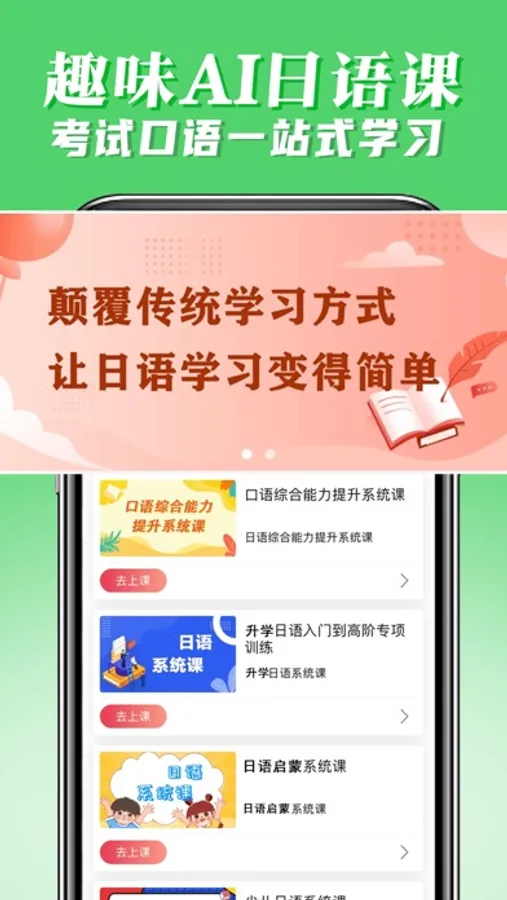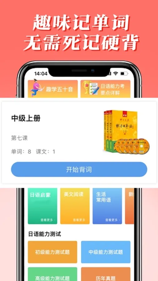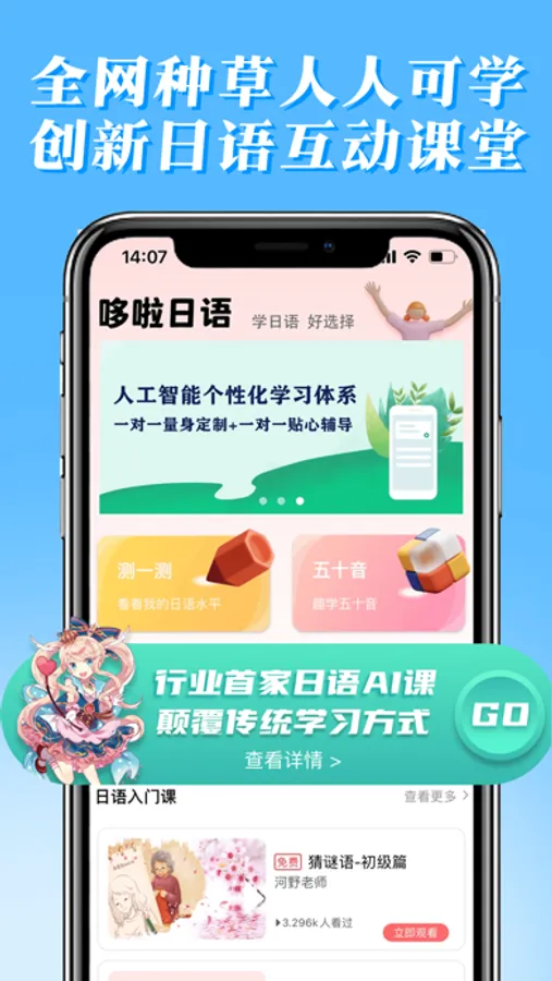 从入门五十音图到JLPT能力考N2、N1,涵盖日语单词、语法、会话、阅读、听力等各个方面,教学练评测五位一体。