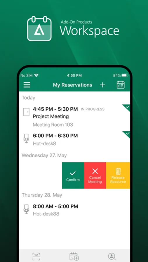 Create, Confirm, End, and Extend reservations of meeting rooms or hots-desks.
