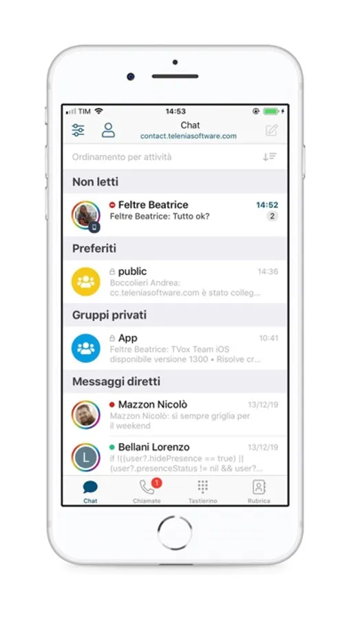 - Chat interna: inviare e ricevere messaggi di testo, audio e video o condividere file e immagini con i tuoi contatti interni o con gruppi di lavoro, con la possibilità di creare dei preferiti di chat.