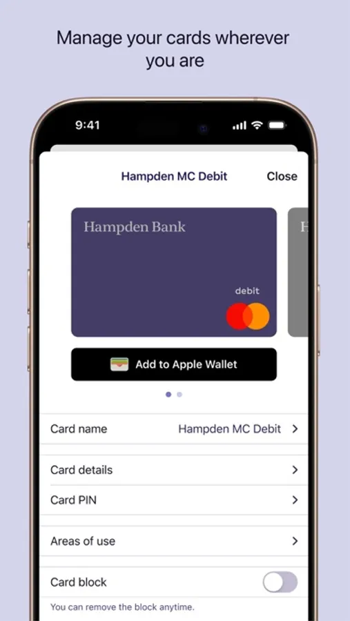 To complement the personal service provided by our Private Bankers we also provide the ability to manage your cards online via our app “Hampden Bank card app”.