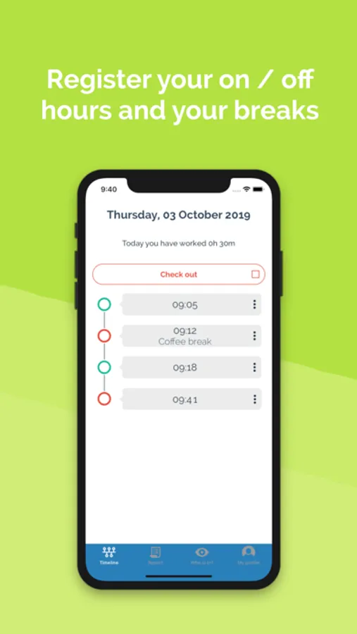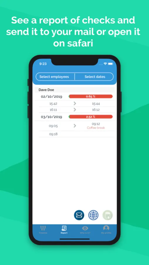 > Get a report of checks (in/out time, location, etc.) for any of your employees and generate a spreadsheet with this report or send it to your e-mail account