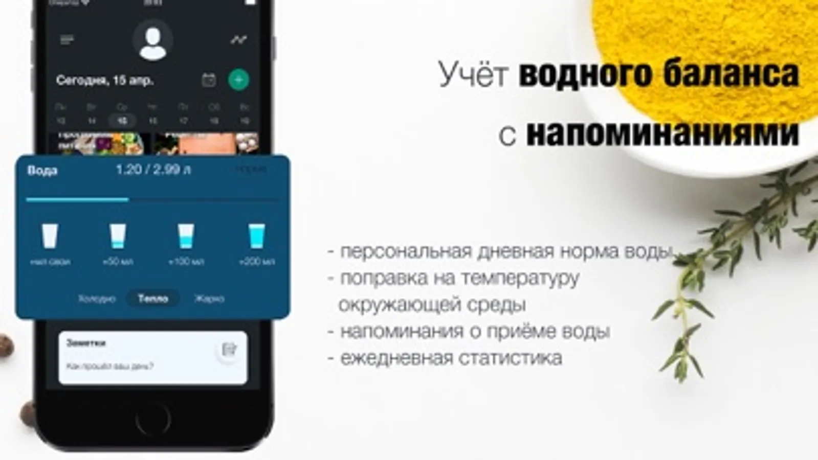 - учет водного баланса в организме (трекер воды) в зависимости от погоды (холодно, тепло, жарко)