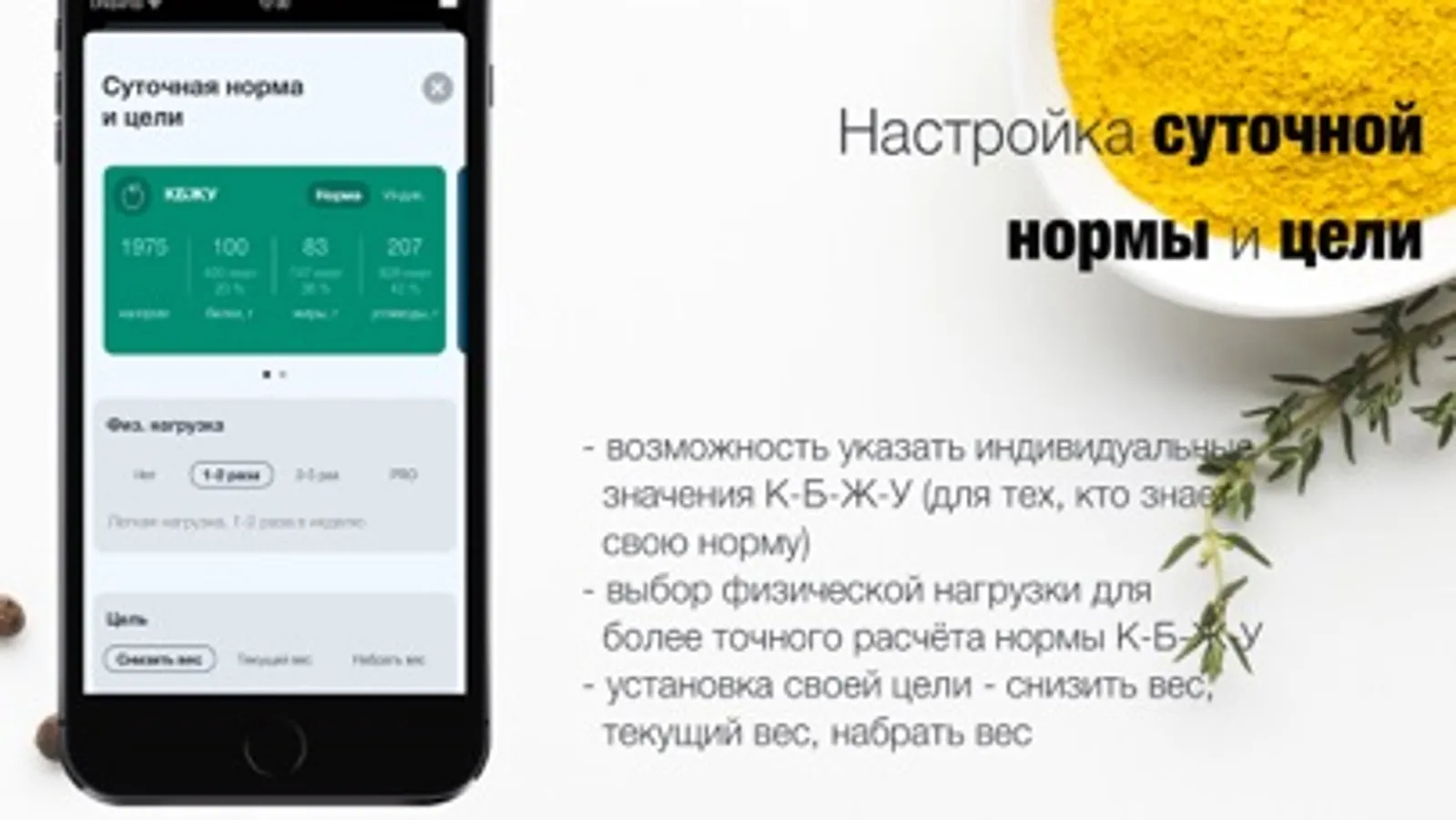 - возможность указания индивидуальных значений Б-Ж-У (для тех, кто знает свою норму)