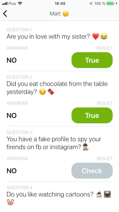 Truth Quiz is a game using a lie detector. Create your own Quiz and send to friends, you will find out which questions have been answered in the right and which are false. The Truth Quiz has a heart rate measurement that checks your heart rate by placing your finger on the camera, while answering one the questions, the user's heart rate is measured.