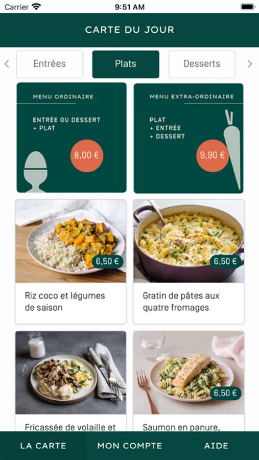 Nos prix tout doux vous permettent de déjeuner sans vous ruiner et sans laisser de côté la qualité : des entrées à partir de 2,90€, des plats entre 4,50€ et 6,50€ et des desserts à partir d’1,25€ !