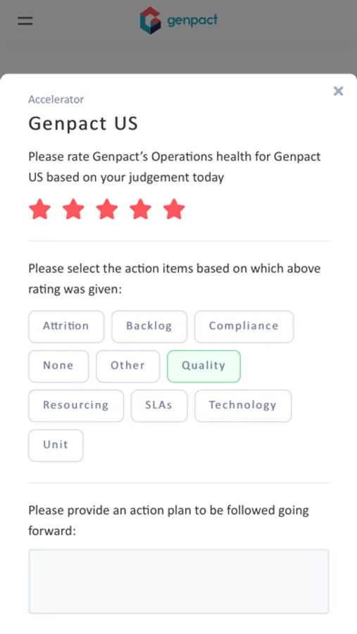 Mobile enabled update on Voice of Delivery & Voice of Sales (health of an account) of customers based on judgment of GOL and GRM which provides an updated concise view on health of accounts for senior leadership team. Enables the leadership team to intervene and assist in resolving problems in accounts which have issues for customers.