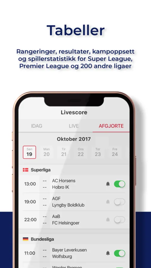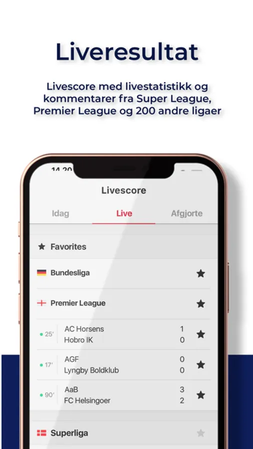 Derudover får du livescore fra alle vigtige fodbold ligaer. Du kan sætte overvågning på alle fodboldkampe eller dine favoritklubber, hvorefter du modtager automatisk besked ved kamp start, mål, røde kort m.m.